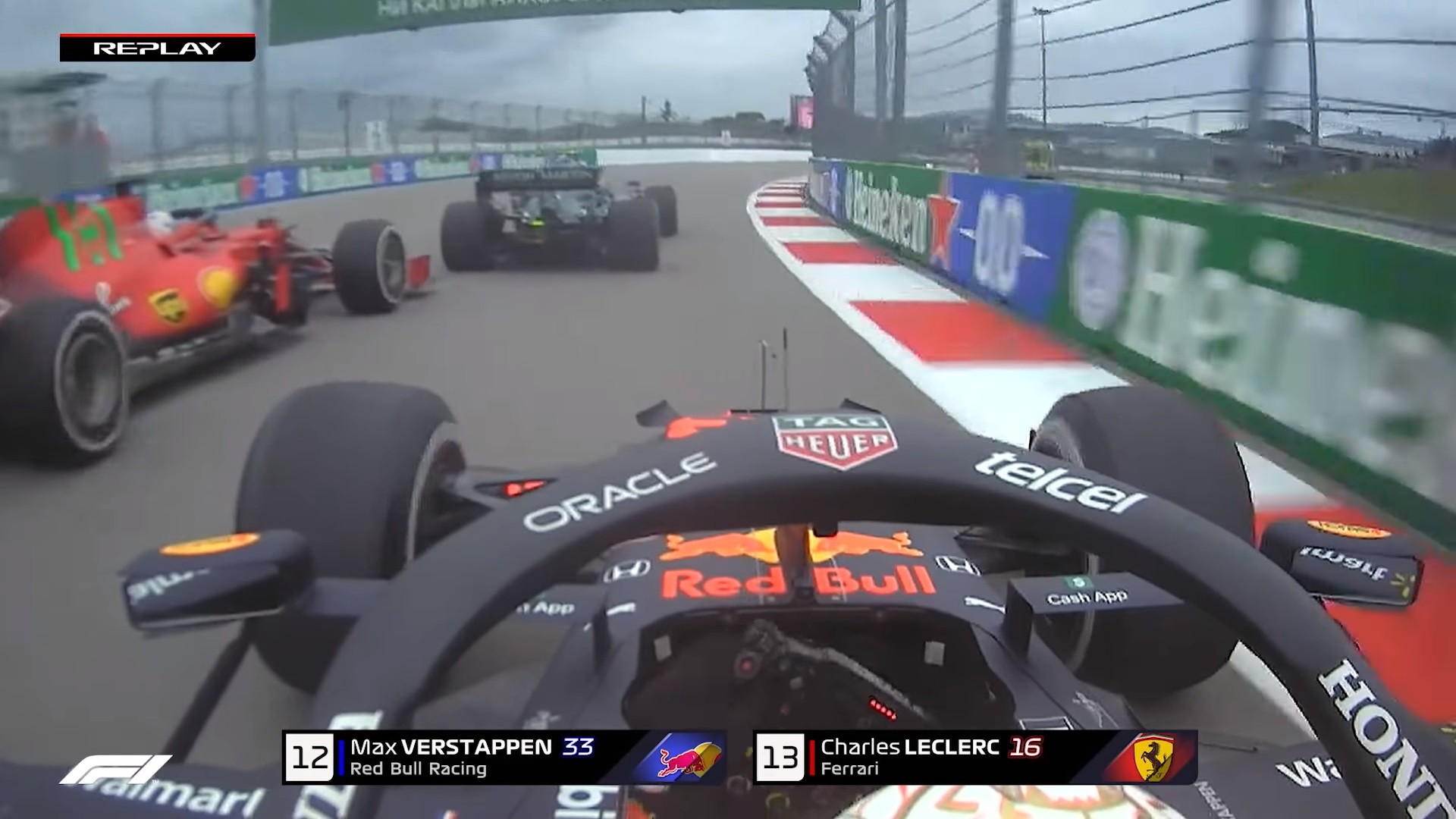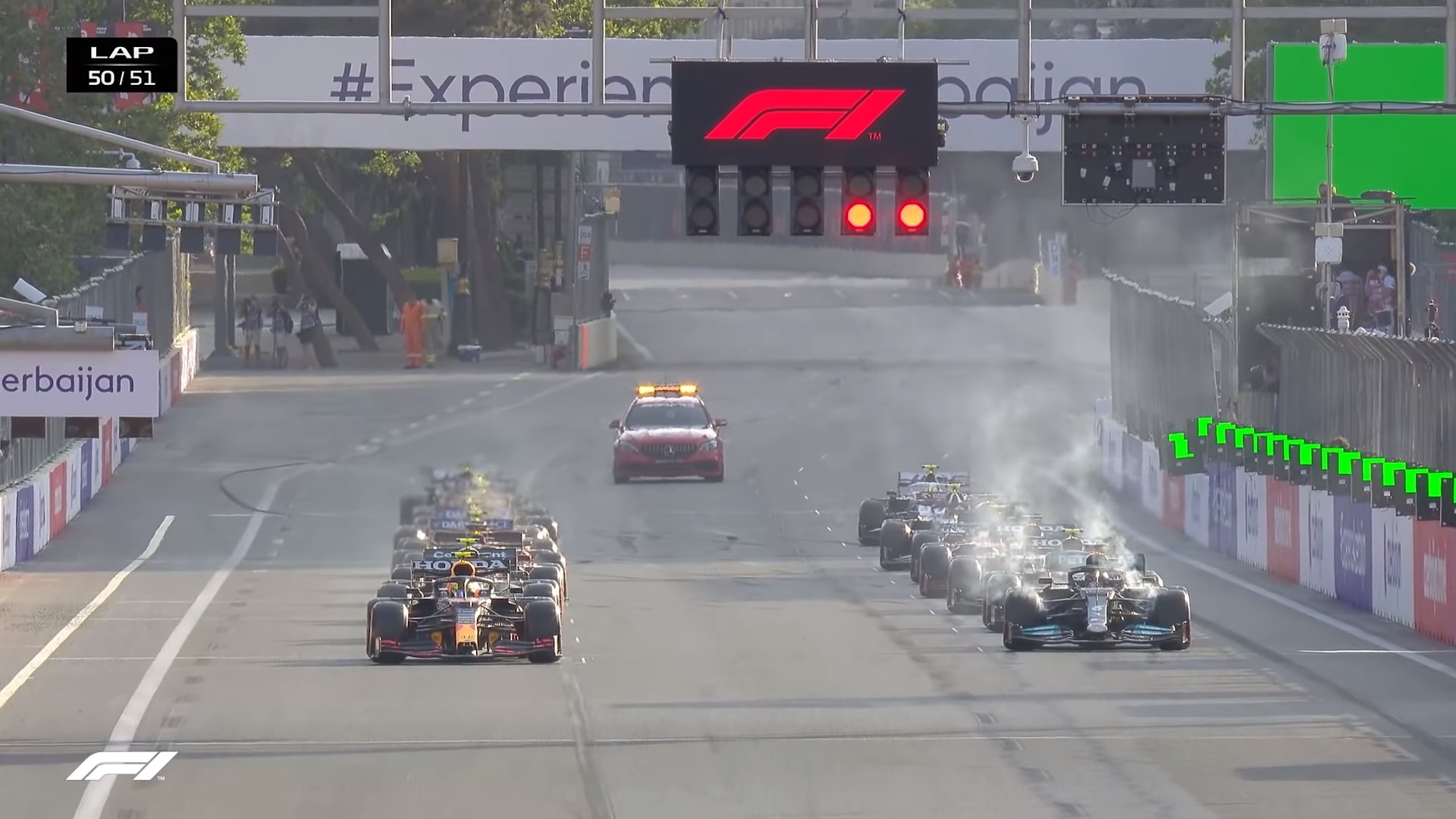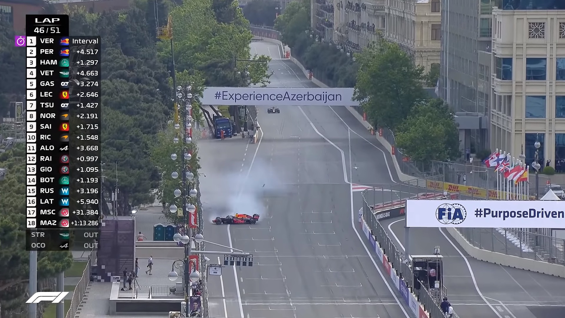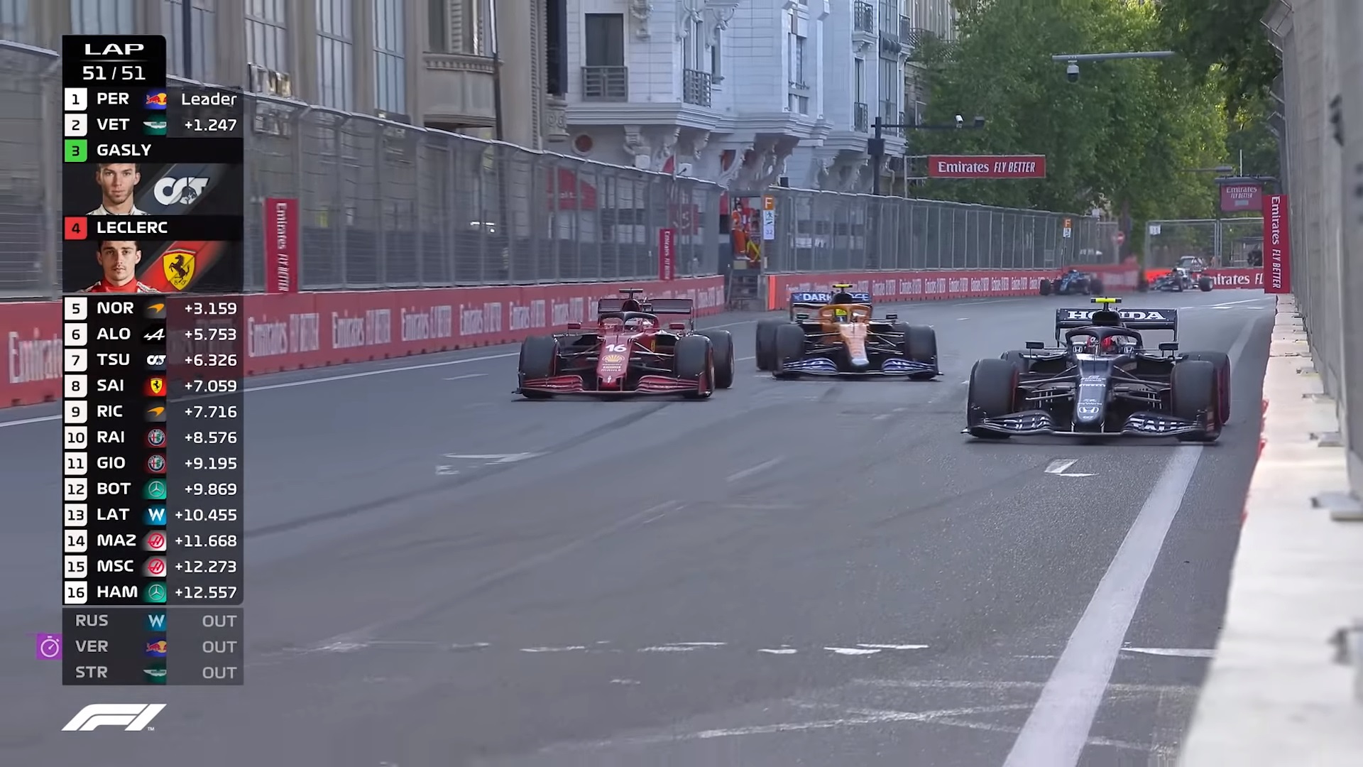 Qualifying for the Azerbaijan GP saw a huge surprise- Charles Leclerc and Ferrari on pole on a track which wasn’t best suited for their car! It was the second race in a row that the red flag decided the outcome of qualifying, with Ferrari benefitting on both occasions. Immediately what was apparent at the start was how comfortable Perez seemed with the car, as he made a stunning and beautiful move around the outside of Gasly at Turn 3, asserting his strength!