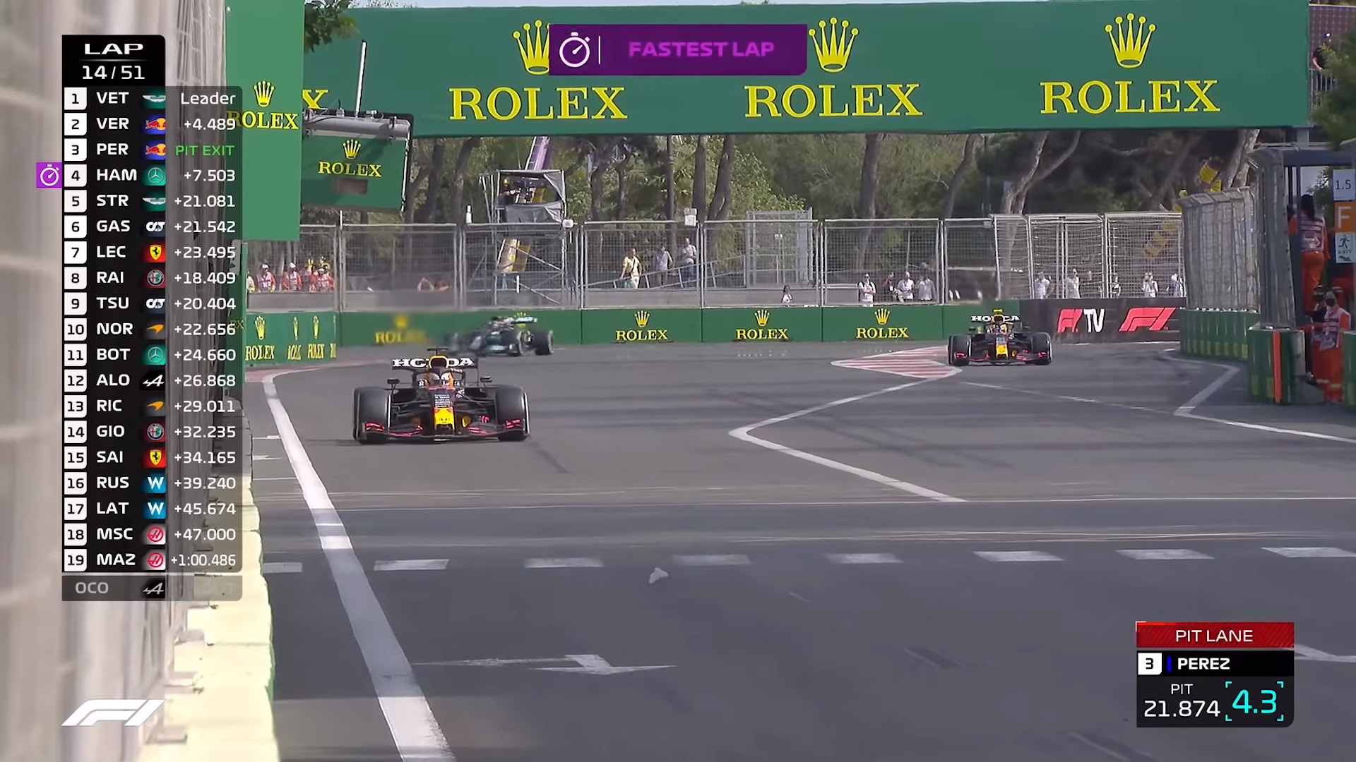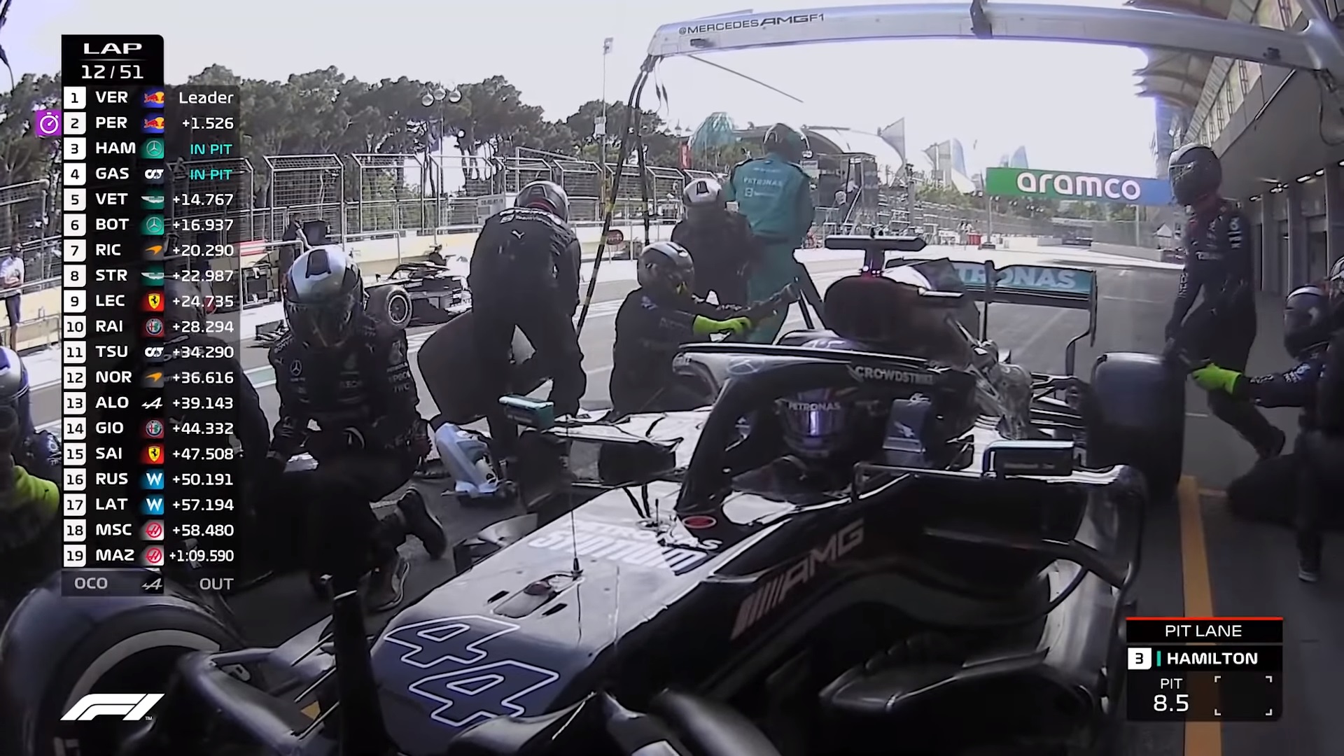 Leclerc was easily passed by Lewis, Max and Perez, and not much happened until the pitstop phase. Lewis was the first to stop, though crucially had to wait longer in the pit box due to having to wait for Gasly to pass. Red Bull bit the bullet and pitted both Max and Checo respectively one after the other in the immediately succeeding laps. Despite a slow stop for Checo, both Red Bulls jumped the Mercedes, who was understandably upset at the whole situation!