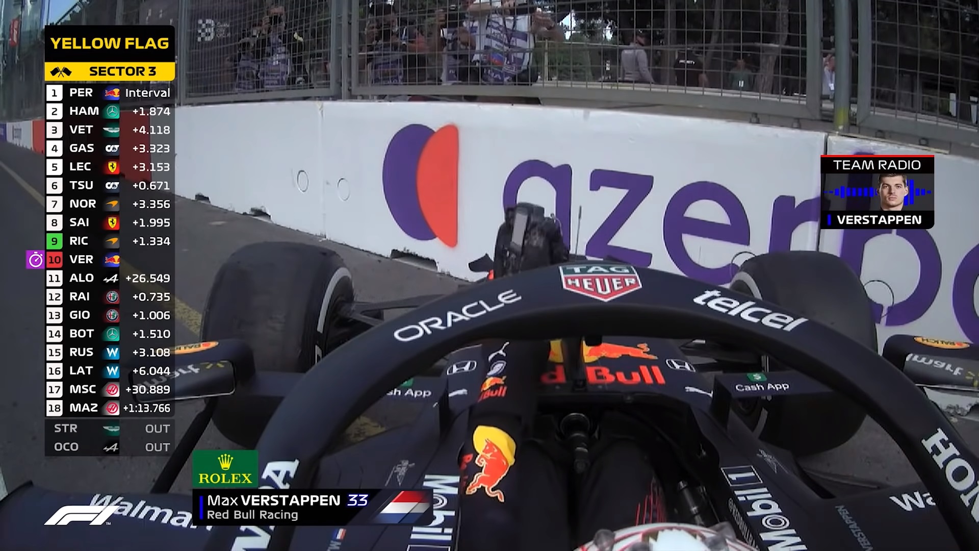 The Red Flag was put out to clear the debris absolutely strewn across the track. While the cars waited in the pitlane for the green flag to be shown, Max’s damage was assessed and it became immediately apparent that he would have an incredibly tall mountain to climb to salvage anything from the race. He was racing with effectively half a car- we can just imagine the amount of downforce he lost, and that too on a track where downforce and aero is needed in spades!