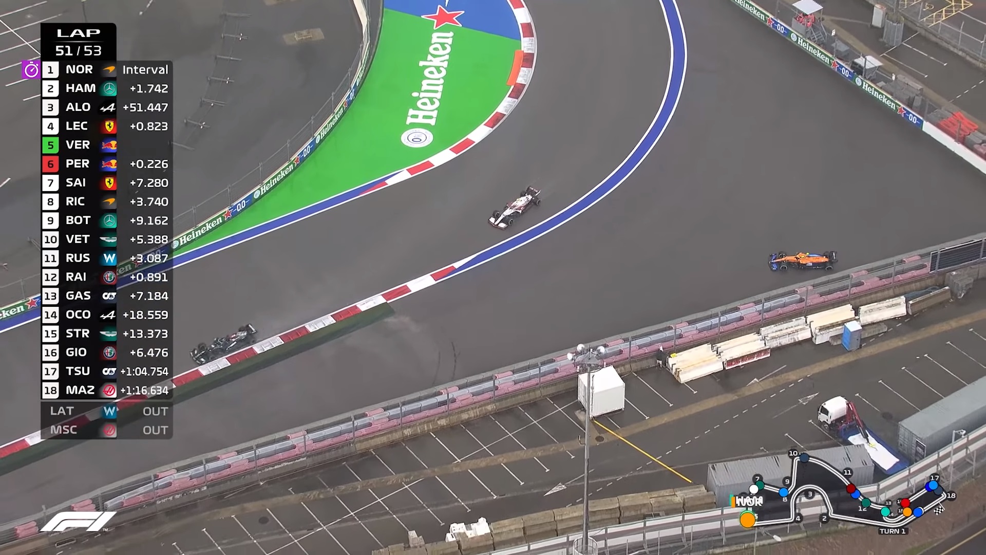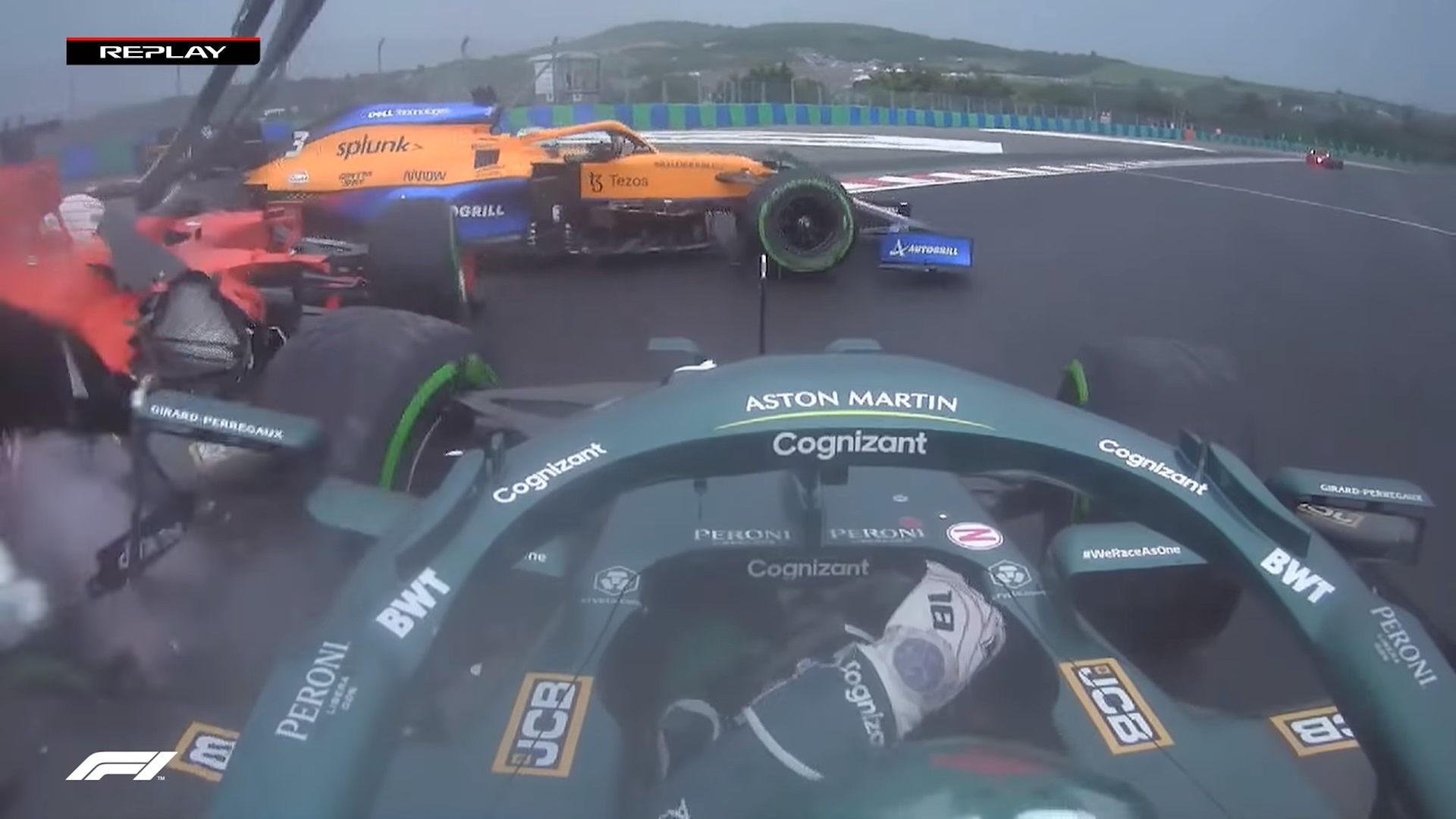 Lando risked it all, and fell short by a few laps. His dream weekend had gone to absolute ruin right at the end, as he finished a lowly 7th. His team radio was a clear indicator of how badly he wanted to hold onto it, as he clearly said “NO” when asked if he wanted to stop! Both Astons also made contact, ruining their races. These few pictures explain the situation in quite an apt manner: