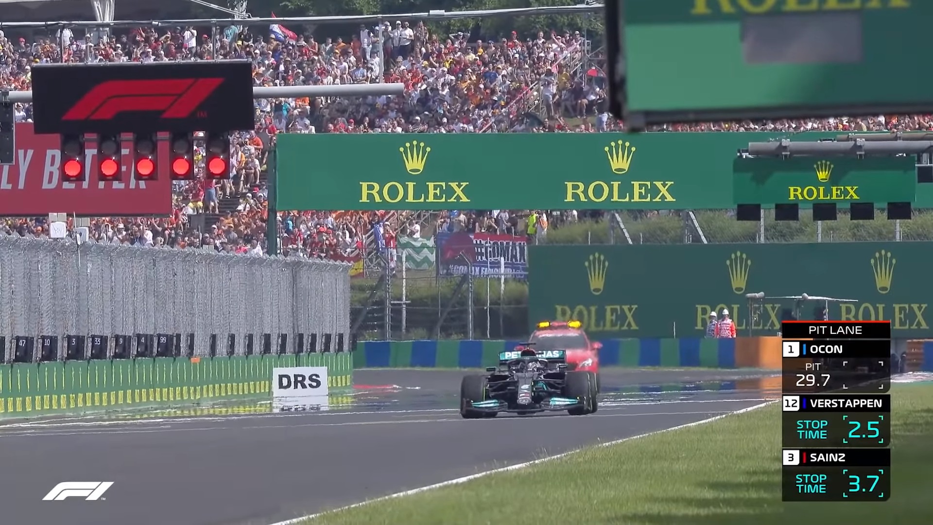 As the cars left the pitlane, the track seemed to be extremely dry. Russell even radioed over to his team: “At this rate, everyone is going to box”, and he was absolutely right. But hold on… Lewis carried on to the grid on intermediate tyres, while everyone else pitted for dries! Surely this was a mistake on either side’s part? It was, and we saw a sight we never expected to see- only one car started the race on the grid, while the others did it from the pitlane after taking on new dry tyres! To say it was a spectacle to behold is an understatement- it was just unbelievable!
