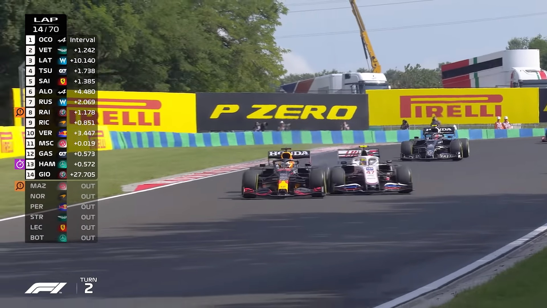 As all the other cars filed out onto the track, Russell led the way though he had to let everyone pass as he overtook others illegally while in the pitlane. Once the kerfuffle was sorted out a bit, we saw the new race leader in the form of Esteban Ocon, followed by Sebastian Vettel in P2 and- wait for it- Nicholas Latifi in P3!
