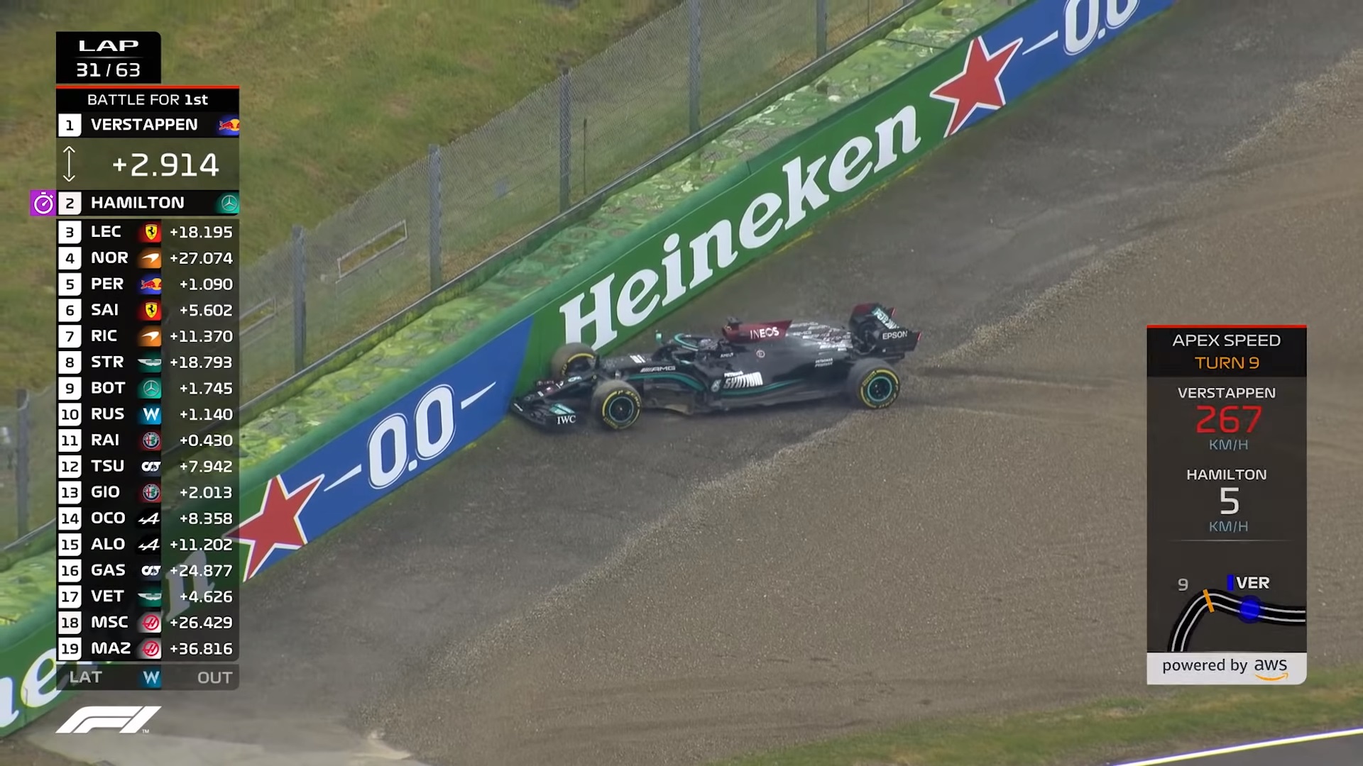 On Lap 31, as it seemed like the race would settle into a rhythm and the usual boring “follow the leader” race would ensue, Lance Stroll had a massive accident while on the hard tyre. His tyres had done 31 laps, and his rear left had failed in spectacular fashion. The Safety car was called out, and the pit entry was also closed. The saga with rear right hard tyre was yet to finish though, as this crash was simply foreshadowing a much more important event later on in the race!