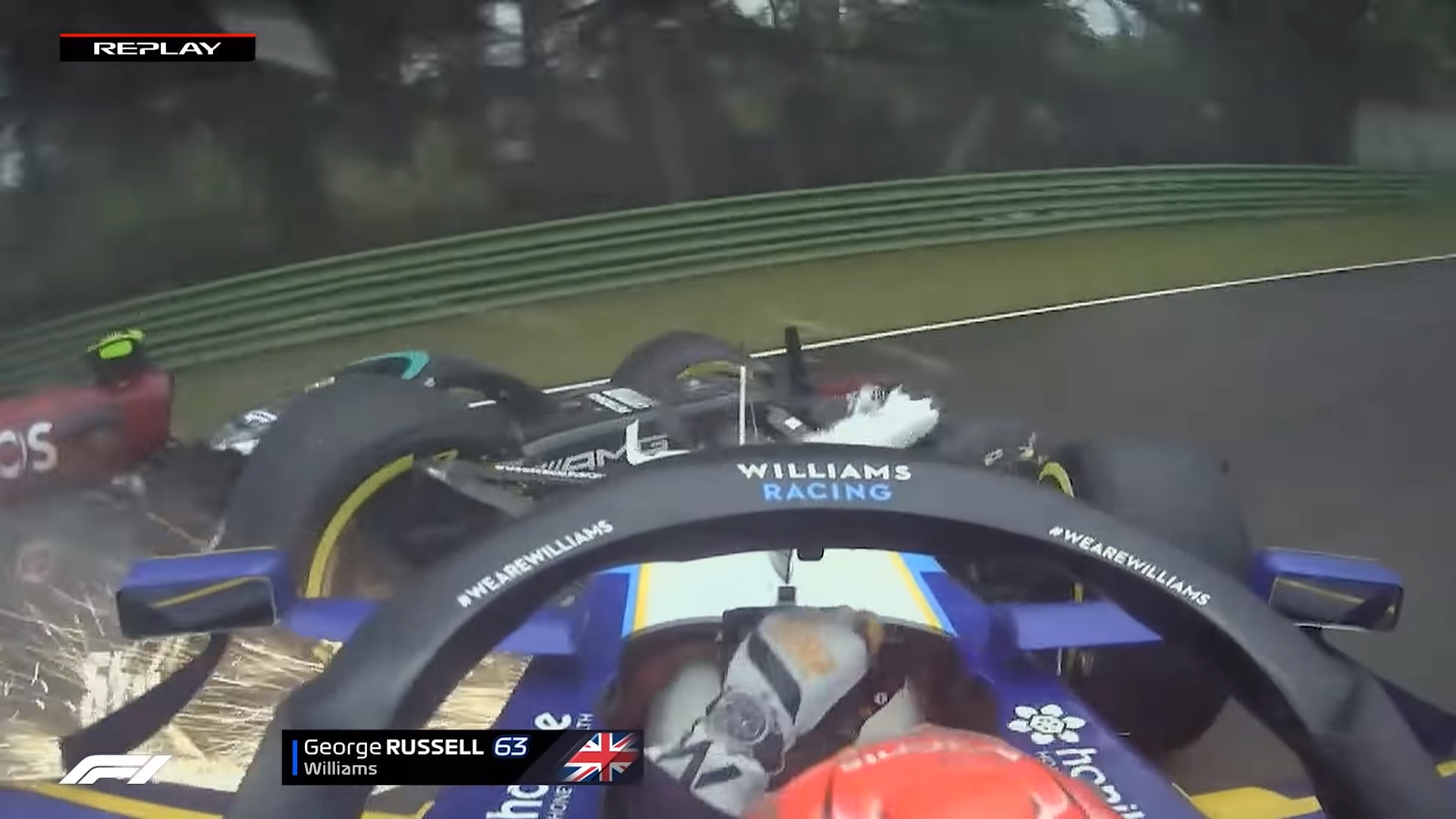 It seemed like this mistake would set Lewis back massively, as he fell from 2nd to 7th, and he hadn’t even made his pitstop to change the front wing! However, this worry was soon put to rest, as Russell and Bottas had a humongous accident- keep in mind that Valtteri was racing George for position. Who was in a Williams. Who was in 9th, while the Finn was in 8th. Why he was that far back is unbelievable, though it became clear- a Mercedes junior had just crashed with a current Mercedes driver, causing the team a lot of social media anguish, and a massive repair bill as well! Russell was livid with Bottas, even giving him a *bonk* on the helmet, though he would later accept blame as well.