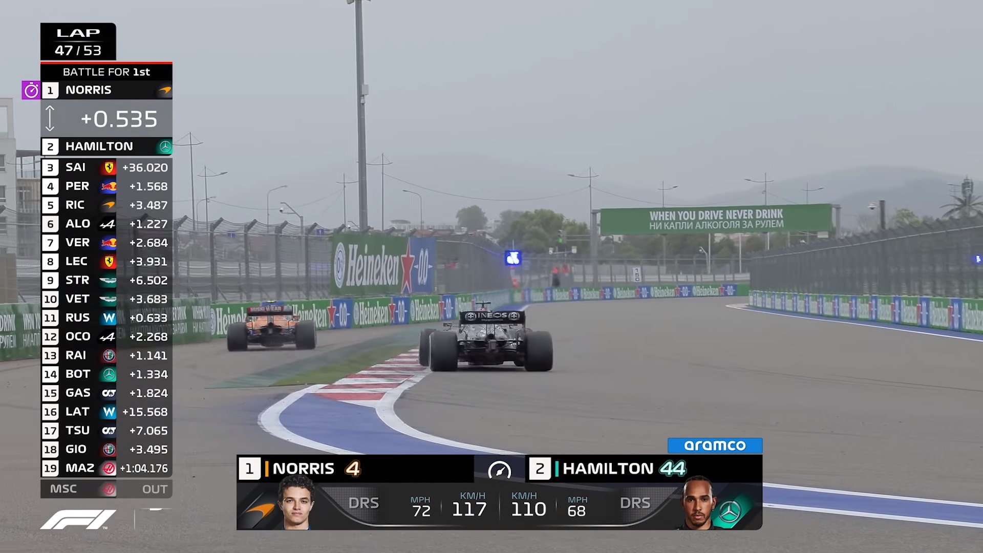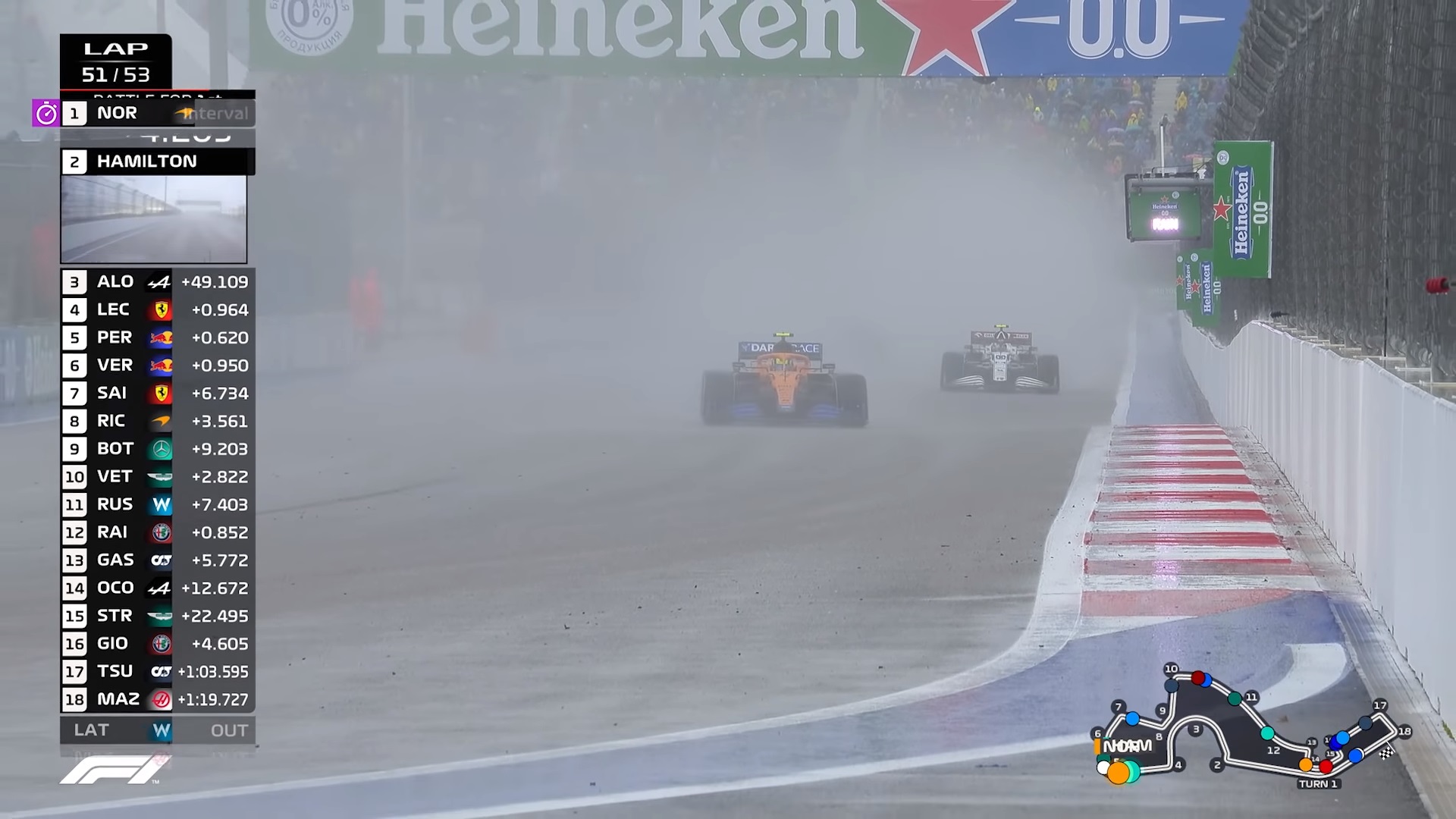 After the pitstop phase, the race stagnated for a while, up until Lap 45, when the rain started to pour. By this point, Lewis had made his way up to P2, while Lando held onto P1. On Lap 47, drama ensued. Lewis was unable to get close to the McLaren driver, though with the rain they both had a gamble to make- stay out on dries and risk it to the end, or pit for intermediates and hope the rain would increase. And guess what? They chose differing strategies!
