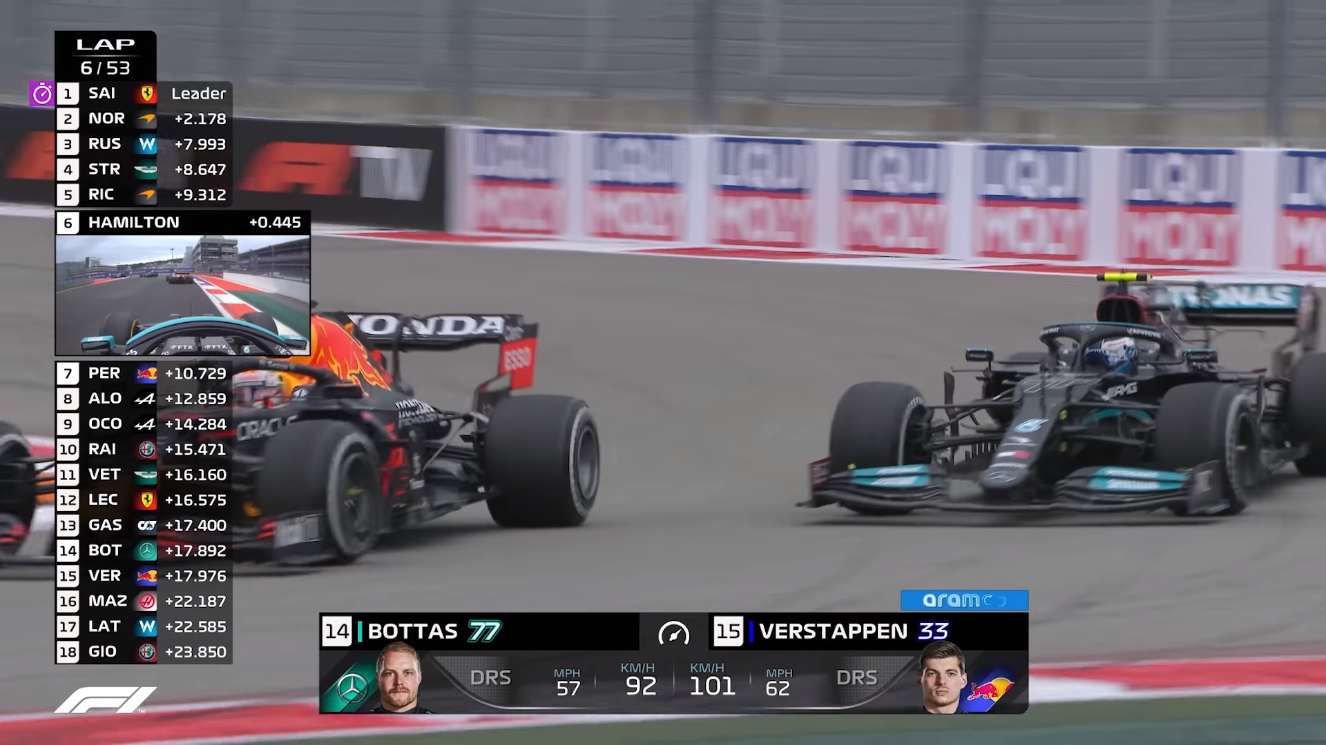 The start was quite crazy- Sainz had a poor launch but a great getaway, and shot into the lead. Further back, Bottas and Verstappen were making slow but steady progress up the field. Alonso showed the entire F1 world how easily rules could be manipulated when he simply straight-lined Turn 2-3, and got away without even a warning!
