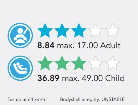 As for the rear passengers, a child dummy which was tested saw good protection to the chest but poor protection to the head and hence the loss of points. Furthermore, the middle passenger at the rear gets a lap belt, which was sufficient but not enough to reduce risk of injuries.