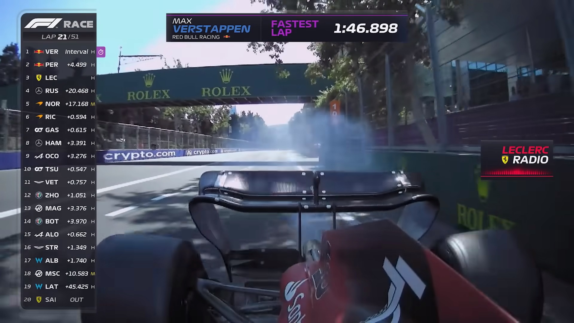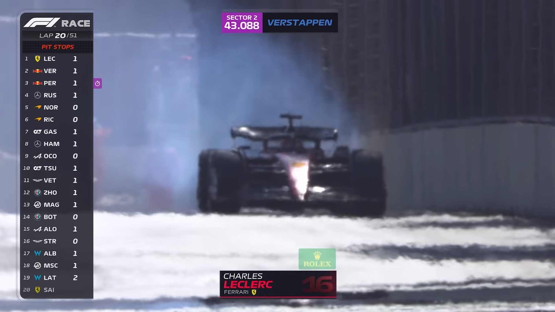 A few laps later Max pitted as well, and emerged net P2 behind Leclerc. The pitting under VSC definitely seemed to be going so well for Leclerc – track position was his and he was leading the Azerbaijan GP… for a whole two laps! His engine let out a puff of smoke, and he came on the radio to the team, and that was curtains on his race- Charles was out. Within 10 laps, both Ferraris had retired – absolute anguish for the team and for the Tifosi!